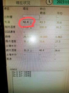お昼過ぎ頃から植付けを始めたので、出てくる言葉はお互いに暑い~の一言。水分補給を時々しながら頑張って植えていきました。でも、やはり、暑い・・・主人は手が、私は足がつりました。そういえば、熱中症の症状の中に手足がつるって何かで聞いたことがあります。これはやばいかもってパソコンの温度計を見ると、なんとハウスの中は、42.4℃。うわぁ本当にやばいかもって・・・ 出荷する時に車のテレビのお昼のニュースで、本日は不要不急の外出は控えてくださいって言ってたような気がする・・・