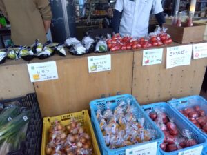 今回は、新米や、かぼちゃ、玉ねぎ、ほうれん草、サツマイモ、ブロッコリー、白ネギ、トマト、レモン、青パパイヤ等が並んでいました。残念ながら、ファーム虹色の野菜たちは、きゅうりが終わってしまったので、出品する野菜がありませんでした。
